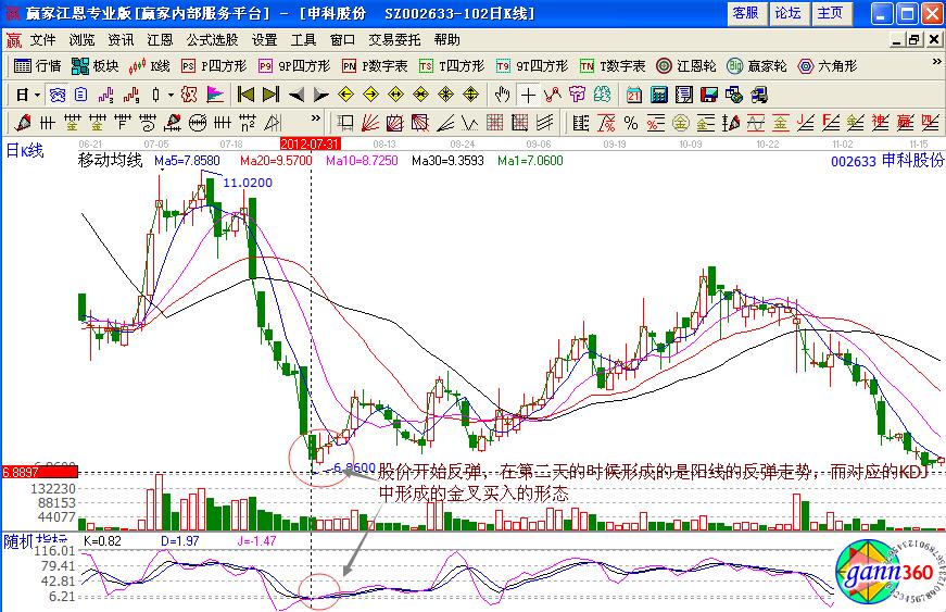 由于周線中KDJ的J值如果連續的處于負值,在反彈的時候更加有效,從該股后期的走勢可以看出,股價出現了反彈的走勢,對應出現了九連陽的走勢,從6.7元的價格上漲到8.89元的價格,累計漲幅達到32%。