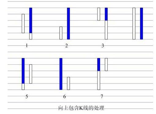 處理這種包含關系需要在向上時,把兩K線的最高點當高點,而兩K線低點中的較高者當成低點,這樣就把兩K線合并成一新的K線;反之,當向下時,把兩K線的最低點當低點,而兩K線高點中的較低者當成高點,這樣就把兩K線合并成一新的K線。經過這樣的處理,所有K線圖都可以處理成沒有包含關系的圖形。