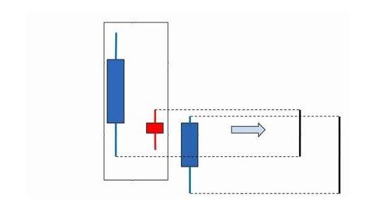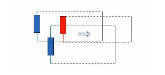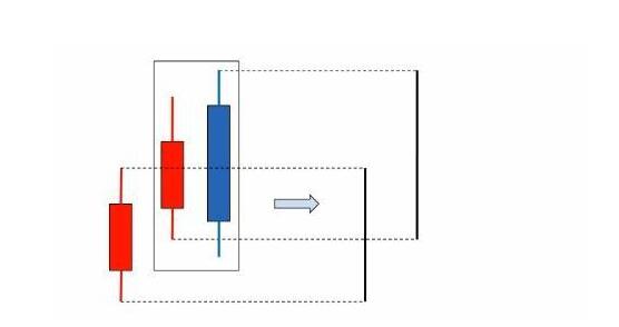 在上升趨勢中,把兩K 線的最高點當高點,而兩K線低點中的較高者當成低點,這樣就把兩K線合并成一新的K線 。