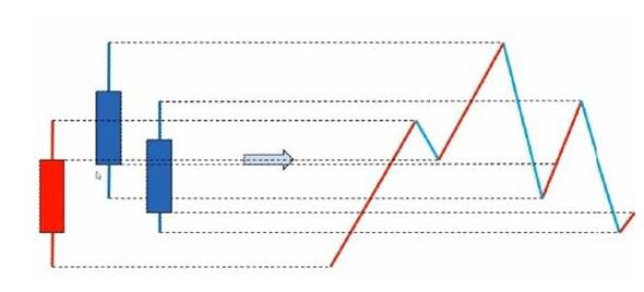在下降趨勢中,把兩K 線的最低點當低點,而兩K高點中的較低者當成高點,這樣就把兩K線合并成一新的K線。