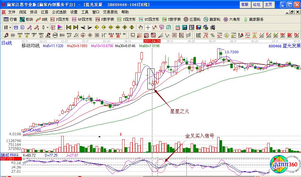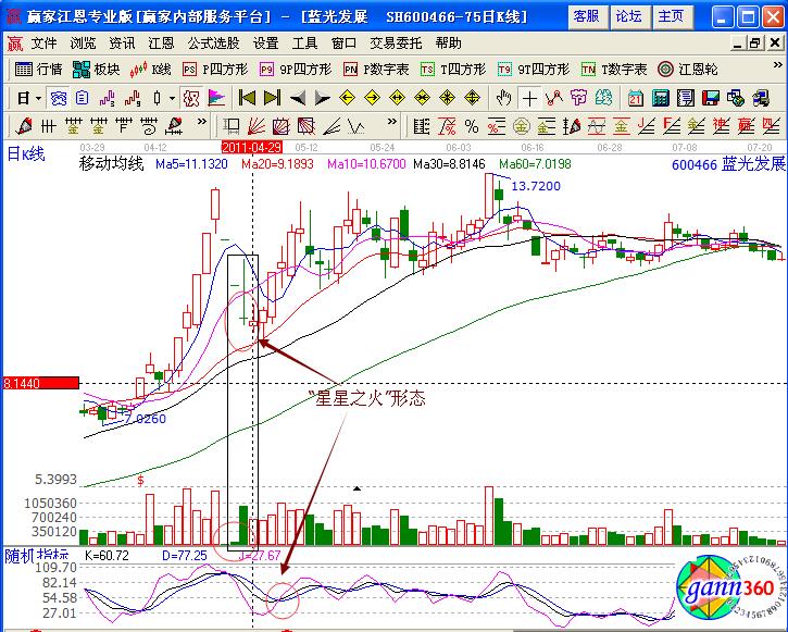 無論是在下跌的走勢行情中還是上漲的走勢變化中,十字星可以說都是變盤的信號,特別是用股票行情軟件在大跌行情中分析的“星星之火”形態,就是意味著股價筑底已經完成,是反彈上漲的征兆。接下來我們就通過藍光發展的實例進行分析。