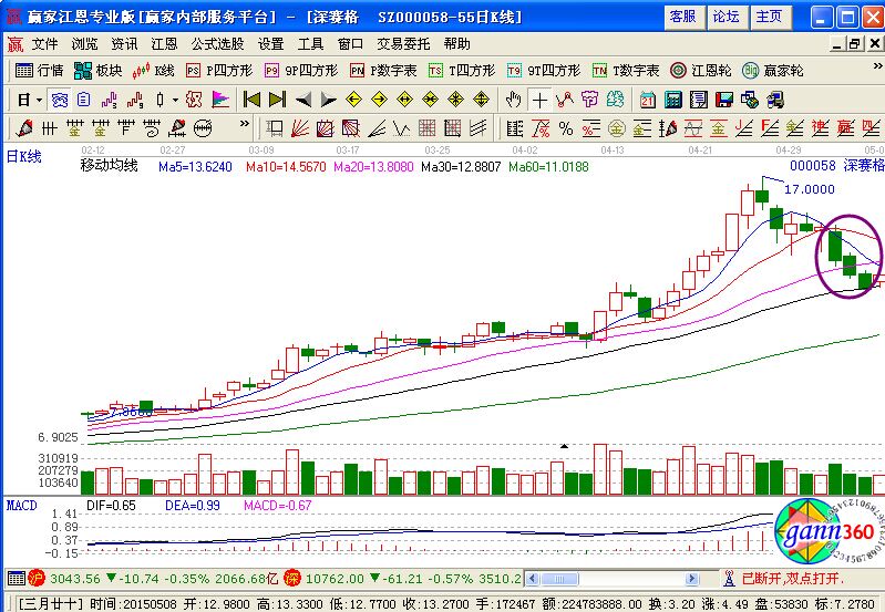 在2015年5月7日的時候,深賽格當(dāng)天收盤是在30日均線上得到支撐,并未跌破,而且當(dāng)時均線呈現(xiàn)的是多頭排列,連續(xù)下跌三天,故當(dāng)時在次日開盤以13元的價位進(jìn)行買入!在5月12日以15.7元的價位進(jìn)行賣出!此次交易獲利20.7%!