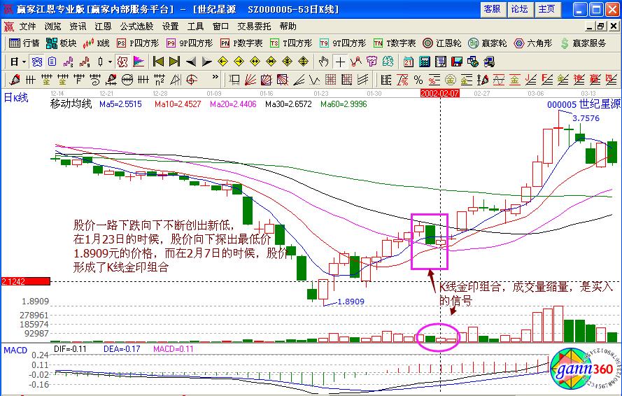在股價探底回升的時候,5日均線由下向上上穿10日均線,股價在10日均線上方形成縮量的金印組合,就可以構成買入的信號。具體的實例如圖世紀星源(000005)在2001年到2002年的股價走勢變化,在2001年底的時候股價一路下跌,在2002年1月23日的時候,股下探到3.12元后展開強勢的反彈操作,之后依據均線系統的走勢,5日均線在股價反彈中迅速掉頭向上,在1月30日的時候上穿10日均線,在2月7日的時候形成了縮量的金印組合形態,是買入的操作信號,投資者可以積極的進行買入操作。