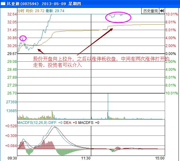 同時(shí)在第四根漲停的位置結(jié)合分時(shí)圖進(jìn)行分析,可以看出該股在5月9日的分時(shí)圖開盤股價(jià)就向上不斷的拉升,之后以漲停板收盤,但是中間漲停板打開了兩次,說明主力意見不一,投資者可以趁此機(jī)會,介入漲停板獲得一部分的盈利。