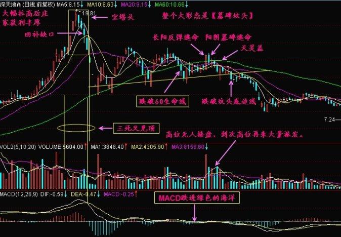 這三種方法就是我們判斷股價頂部的重要因素:“跌破60日生命線”、“三死叉見頂”、“MACD跌進綠色海洋”。這三種方法完全可以判斷一只股票是不是頭部,如果判斷到這只股票正好在做頭部,那就果斷一點,直接離場,這種情況不能夠猶豫一定要撤退。