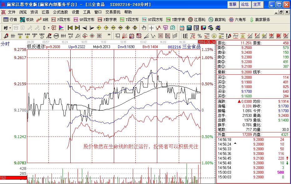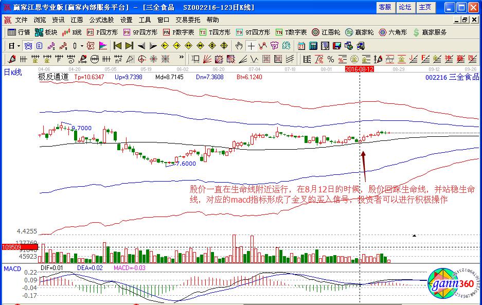 那么在了解了基本的消費(fèi)類股票之后,投資者應(yīng)該怎樣分析消費(fèi)類股票呢,我們可以通過三全食品(002216)的個(gè)股走勢進(jìn)行分析,如圖該股在2016年8月份在極反通道生命線附近的走勢,股價(jià)在8月12日的時(shí)候,回踩生命線,是在強(qiáng)勢區(qū)域中運(yùn)行,而且對(duì)應(yīng)的macd指標(biāo)給出的是金叉買入的操作信號(hào),投資者可以大膽的進(jìn)行買入操作,同時(shí)注意其上方藍(lán)色上軌線是股價(jià)上漲的壓力位置,在不突破壓力出現(xiàn)下跌回調(diào)的時(shí)候,可以考慮賣出操作。