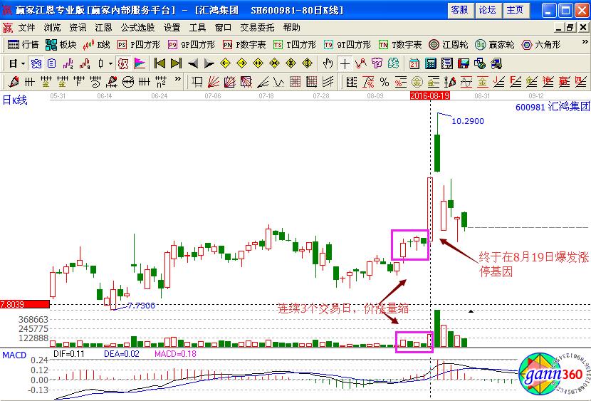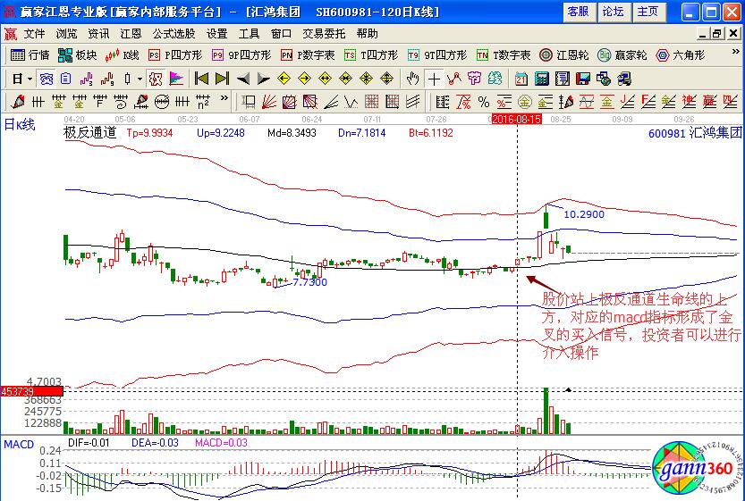 如圖匯鴻集團(tuán)(600981)在極反通道中的走勢形態(tài),在2016年8月份的時(shí)候,股價(jià)一直處于生命線的附近運(yùn)行,類似與橫盤整理的形態(tài)(股票橫盤是什么意思),之后繼續(xù)觀察其股價(jià)的走勢變化,可以看出在8月15日的時(shí)候,股價(jià)站上了生命線的上方,進(jìn)入強(qiáng)勢區(qū)域運(yùn)行,而且對(duì)應(yīng)的macd指標(biāo)形成的是金叉買入的操作信號(hào),投資者可以在該位置進(jìn)行買入操作,等待后市的上漲形態(tài)。
