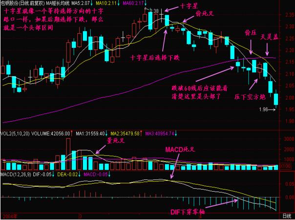 如圖包鋼股份在04年的股價走勢形態,在頂部的時候形成了十字星的走勢,就像是一個等待選擇方向的十字路口,如果后期選擇下跌,就是一個頭部區間,而圖中選擇的是下跌的走勢,均線形成了價死叉的形態,之后股價由于受到均線的壓制,投資者可以在頭部出現十字星形態的時候,選擇及時的賣出獲利,以規避后期股價走勢的下跌形態,而造成的資金損失。同時,均量線與macd指標都形成了死叉的走勢形態,給出了賣出的信號,預計著股價的下跌走勢形態;