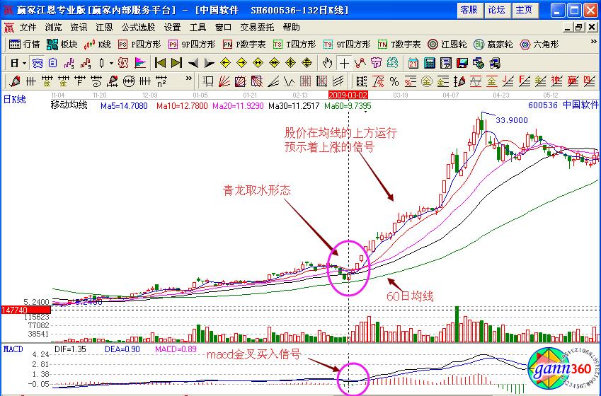 如圖中國軟件(600536)在2009年3月2日的時(shí)候,股價(jià)前期一直處于下跌徘徊的走勢,并形成了青龍取水的形態(tài),也就是牛股龍形,之后股價(jià)在60日均線的附近位置下跌之后,繼續(xù)反彈上漲,并沒有跌破60日均線,之后股價(jià)在均線的上方運(yùn)行,均線形成多頭排列的形態(tài),是一個(gè)強(qiáng)烈的上漲信號,投資者可以在該點(diǎn)位置進(jìn)行買入操作。