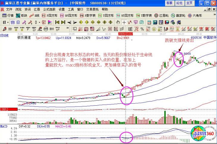 同時(shí)對比在極反通道中的走勢形態(tài),股價(jià)在3月2日的時(shí)候剛好處于生命線的上方,是強(qiáng)勢運(yùn)行的信號,而且量能微微縮小,macd指標(biāo)形成金叉走勢,之后的量能逐漸的放大,是一個(gè)穩(wěn)健的買入點(diǎn),之后股價(jià)向上突破了藍(lán)色上軌線,并突破紅色外軌線運(yùn)行,在股價(jià)跌破紅色外軌線的時(shí)候,投資者要考慮賣出的操作。