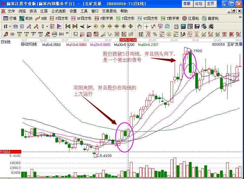 具體的實戰案例如圖五礦發展(600058)在2005年2月4日的股價走勢變化,形成了“雙陽夾陰”的K線組合形態,而且第二根K線在5日均線的上方運行,短期均線也形成了多頭排列的基本形態,而且對應的成交量形成的是倍量放大的走勢,在介入該股之后,股價一路沿著5日均線向上運行,雖然中間有小幅的下跌走勢,但是整體的行情是上漲的走勢,所以投資者可以放心的持有,在股價向上運行到8.79元的價位之后,出現了一根大陰線,向下跌破了5日均線的支撐作用,并且均線也出現了拐頭向下的走勢形態,這個時候投資者可以考慮及時的賣出獲利。