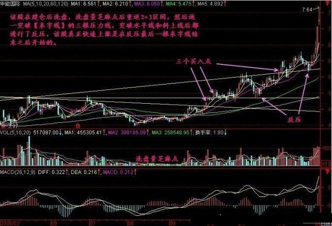 同理可以分析,華能國際從2006年2月到8月的股價走勢,在建倉洗盤后,量能較小,此時形成的米字線形態,需要投資者注意其中的三根壓力線與股價的變化,突破水平線,和斜向上線后都進行了反壓,在突破壓力之后,才會出現真正的上漲,其中,最后一根線突破之后的上漲幅度是最大的,希望投資者能夠把握其中的買入點位置。