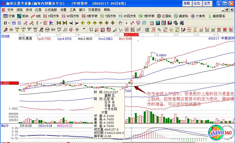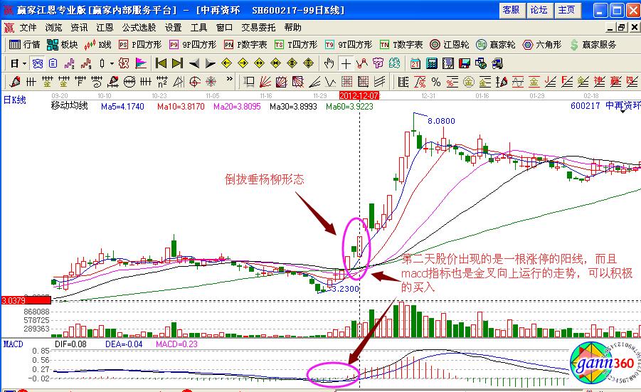 按照基本的技術操作要點進行分析,如圖中再資環(600217)在2012年12月7日的股價走勢,形成了倒拔垂楊柳的基本K線組合形態,處于上漲的走勢形態,而且均線是多頭發散的形態,對應的macd指標也是剛剛出現金叉之后,向上攀升運行的趨勢,投資者可以積極的進行關注。