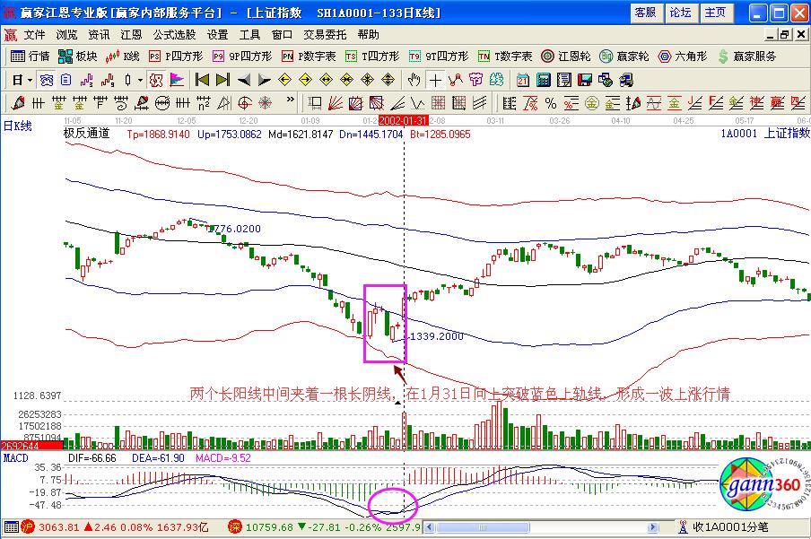 通過江恩軟件進行分析,發現在1月28日的時候,K線形成的是兩個長陽線中間夾著一些小陽線和一根長陰線,并且在1月31日的時候,向上突破藍色上軌線,預示著一波上漲的走勢行情,再加上此時macd指標形成的是金叉買入的操作信號,投資者可以積極的金叉買入操作。