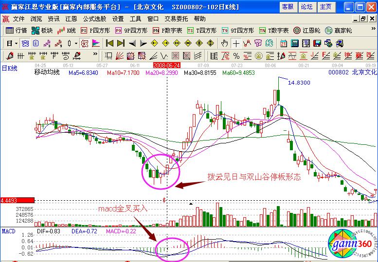 具體的實戰(zhàn)案例如圖北京文化(000802)在2008年6月底的股價走勢,在日K線中形成的是連續(xù)下跌的走勢,6月24日的時候形成了撥云見日與雙山谷停板的形態(tài),并且最后一個漲停板的形態(tài)包含了最大的陰線實體,并且上漲的幅度在5%以上,對應(yīng)的macd指標(biāo)形成的也是金叉買入的信號,大膽的投資者可以在該位置進行短線介入。