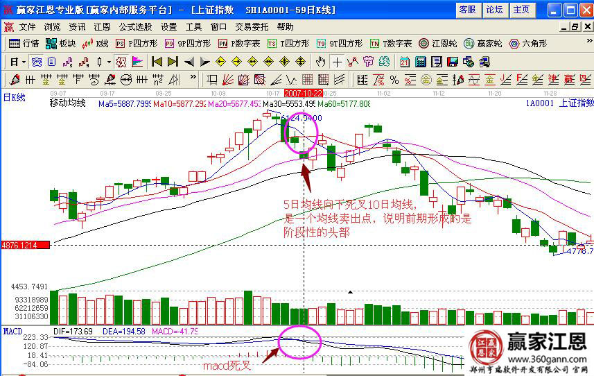 如圖上證指數(shù)在2007年10月份的走勢(shì)變化,指數(shù)經(jīng)過(guò)上漲拉升到達(dá)6124.04的高點(diǎn)之后,開(kāi)始下跌回落,此時(shí)5日均線(xiàn)下穿10日均線(xiàn)形成了高位的一個(gè)死叉,是賣(mài)出的信號(hào),說(shuō)明前期的走勢(shì)已經(jīng)形成了一個(gè)階段的高點(diǎn);