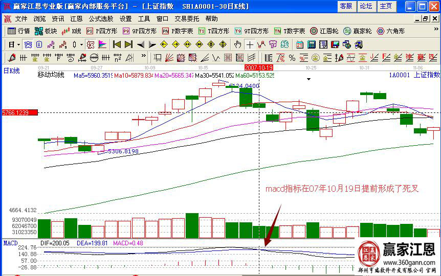重要的是macd指標(biāo)買(mǎi)賣(mài)點(diǎn)的確認(rèn)情況,分析上漲指數(shù)在2007年10月19日的走勢(shì)變化,指數(shù)在下跌的第三天,均線(xiàn)拐頭向下,macd指標(biāo)形成了死叉的賣(mài)出信號(hào),這個(gè)時(shí)候投資者應(yīng)該已經(jīng)是選擇賣(mài)出了。這個(gè)時(shí)候發(fā)現(xiàn),均線(xiàn)死叉、均量線(xiàn)死叉、macd指標(biāo)死叉是連續(xù)的出現(xiàn),說(shuō)明前期的走勢(shì)形成的是一個(gè)短期的頭部形態(tài),希望投資者把握其中的盈利機(jī)會(huì)。
