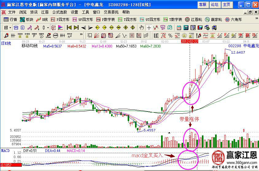 觀察之后的個股走勢,沿著短期均線向上運(yùn)行,在2012年2月22日的時候形成漲停大陽線,并且放出大量,macd指標(biāo)形成的是金叉買入的信號,紅柱線不斷的拉長,是上漲行情的預(yù)示信號,投資者可以積極的進(jìn)入等等后市的主升浪行情走勢。