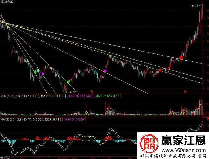 指的是股價(jià)會(huì)不斷的創(chuàng)出新低,直到不再創(chuàng)出新低,在下跌的趨勢(shì)中,投資者只要明白,如果股價(jià)在突破扇骨線的時(shí)候,前面的股價(jià)曾經(jīng)創(chuàng)出了新低,那么這個(gè)時(shí)候的突破點(diǎn)就不是買入點(diǎn)的位置。如圖福田汽車中的走勢(shì)形態(tài),其中的綠色點(diǎn)位就不是買入點(diǎn)的位置;