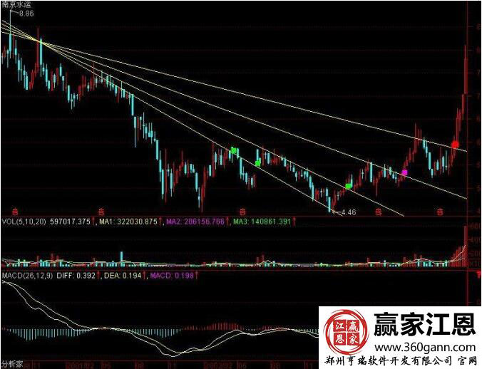 如圖該股的走勢(shì)形態(tài)形成了一個(gè)階段性的最高點(diǎn),而且在之后的突破點(diǎn)中,都沒(méi)有突破新高,從其畫圖的走勢(shì)中,能夠看出,扇骨線具有三個(gè)基本特征:伺從性,指的是K線會(huì)依據(jù)扇骨的走勢(shì)進(jìn)行運(yùn)行;支撐向,股價(jià)一旦沖過(guò)扇骨線以后,再回落的話,一般壓不到前面的扇骨線;突破性,只有突破才有行情,沖不過(guò)去就沒(méi)有行情;