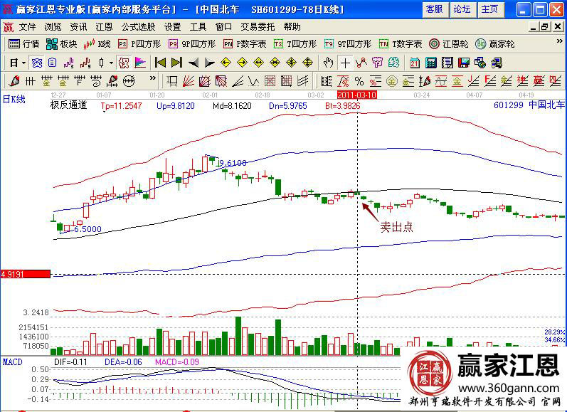 對比在極反通道中的走勢形態,股價在2011年3月10日就已經跌破了生命線,向下運行,進入弱勢區間,是另一波下跌行情的開始,此時投資者可以看出macd指標死叉信號明顯,并且是在低位運行,可以積極的考慮賣出行為。