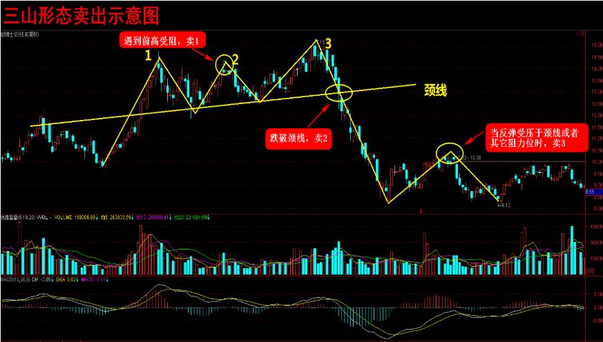 上圖是一個非常典型的三山形態案例,我們分析鵬博士的走勢圖,可以總結一下三山形態賣出條件為: