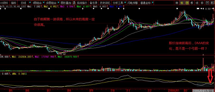 該股在接下來的第二天是跳空高開,跳空漲幅收盤之后,DMA指標(biāo)以及均線系統(tǒng)都有所變化,且5、10、30日均線都頂在股價的屁股上了,之后股價3天的漲幅,已經(jīng)把DMA修復(fù)的特別好,再看DMA白線與黃線的關(guān)系,想弓箭一樣,如下圖所示。
