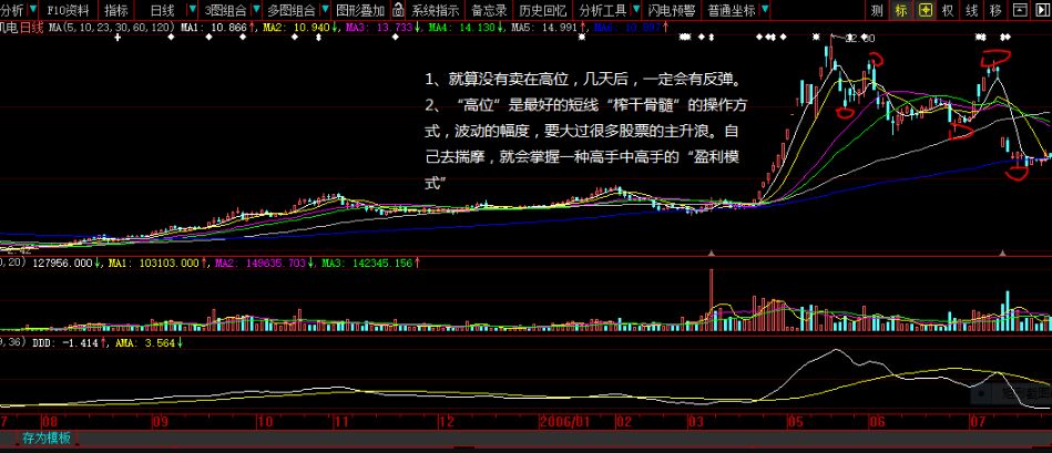 當(dāng)然就算沒有走成也不要緊,第二天見價就賣,就算是跌到-7%最低價也要賣,因為股價在高位,波幅很寬,有機(jī)會再低一些位置買回來,就有15%以上差價把損失掉的少賣部分撈回來。你們看看下圖的波幅,比很多股票的主升浪都好。比很多股票的主升浪都好。這也是很多技術(shù)派的一種賺錢方式。