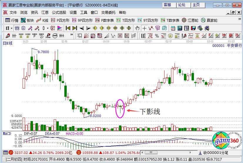 了解下影線測市法,首先要先了解什么是下影線。在k線圖中,下影線指的是從實(shí)體向下延伸的細(xì)線,如下面平安銀行走勢圖中所表示的K線。