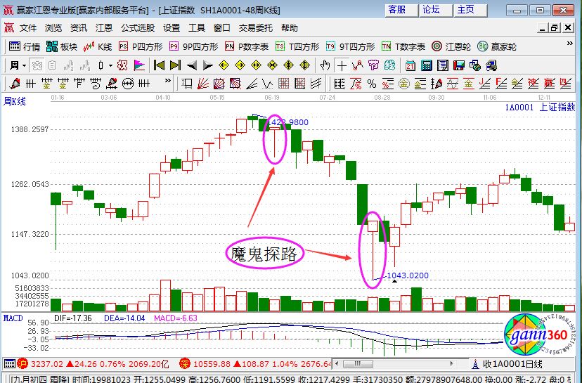 依據(jù)以上論述推測:這條下影線出現(xiàn)在大盤的高位,兩市的慢牛行情已持續(xù)了大半年,總體升幅已達(dá)50%以上。根據(jù)走勢看,前半周大盤先以小陽攀升已收復(fù)了大部分失地,無疑此下影線短期上對大盤產(chǎn)生一定的止跌作用。但下半周市場又開始展開調(diào)整,并侵吞了去年8月23日下影線的大半部分。因此技術(shù)上顯示不排除主力先誘多然后出逃的可能。加之周K線收陰,故而上上周的下影線屬于“魔鬼探路”的可能性就很大了。