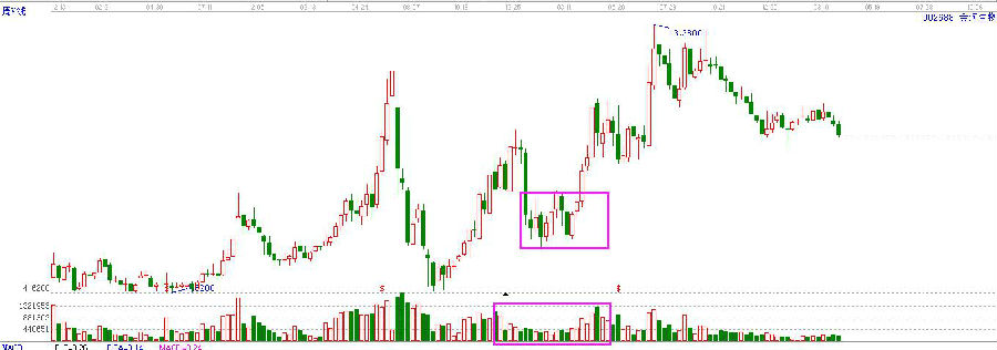 這里還有一點(diǎn)需要我們注意,如果一支股票股價(jià)下跌的幅度越來(lái)越小,或者是直接出現(xiàn)跳空下跌的缺口,成家量也伴隨著大幅的縮小,然后又出現(xiàn)放量股價(jià)拉升的情況,那就是市場(chǎng)見(jiàn)底的表現(xiàn)。其實(shí)在成交量見(jiàn)底的時(shí)候,也代表著投資者對(duì)于該股票的期待情緒降到最低的時(shí)候,在下跌的過(guò)程中,賺錢(qián)該走的都走了,虧損的也套死不愿意動(dòng)了,市場(chǎng)的交易已經(jīng)變的很清淡,按照中國(guó)易經(jīng)里講的,物極必反:全則必缺、極則必反,下跌至一定的程度之后,必定要向相反的方向運(yùn)行,底部形成,就是放心大膽的買(mǎi)進(jìn),然后耐心等待市場(chǎng)反轉(zhuǎn)拉升。