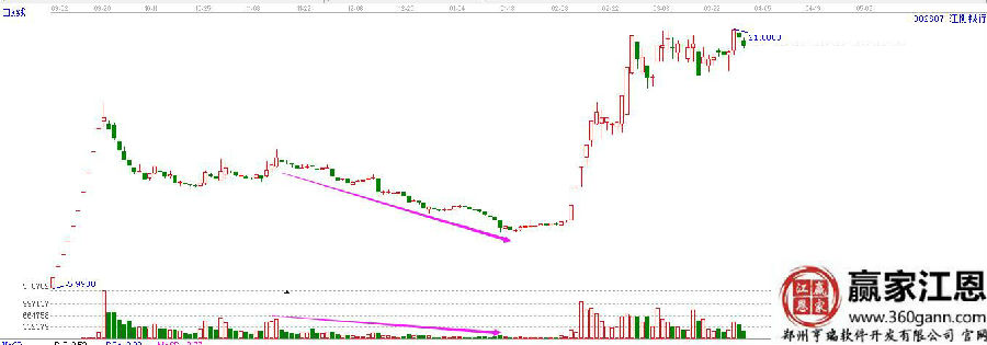 有一些個股在連續的下跌過程中,成交量也隨之連續的縮小,這樣的過程其實就是場內已經沒有多少交易者參與了,要不就是深套不想動,要不就是看著不想買。而這種時候,當成交量縮小到一定程度,價格下跌至一定程度,就會看到慢慢的有成交量釋放出來,這其實就是一個信號,有人開始悄悄的建倉了,股價也會因為成交量的放大出現微微的拉升,一旦出現大的成交量就是,個股的拉升也是很快速的,像這樣的低位放量是可以參與的。