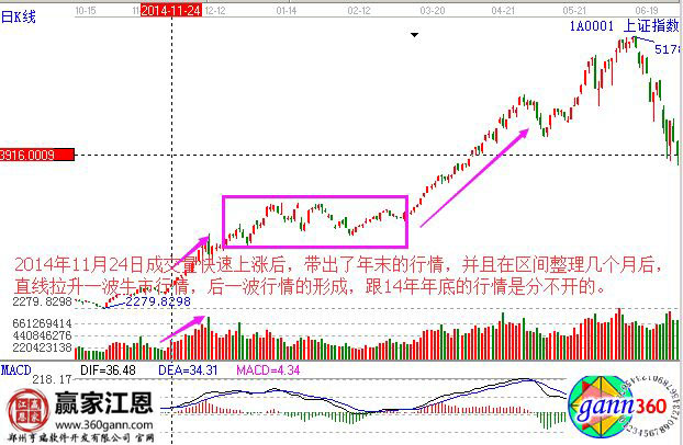 以大盤為例,在2014年11月24日大盤的成交量急速放大后引導了14年年末的行情。經過三個月的箱體整理,隨著15年年初的成交量的更持久的一波行情,這跟14年年末的成交量的急劇增大是密不可分的。