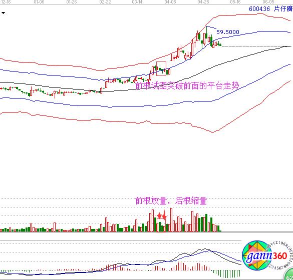 2、股價(jià)放量上漲,在某日出現(xiàn)了上影線的回落走勢(shì)。