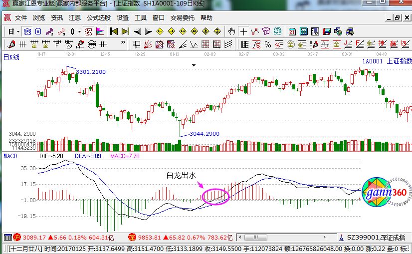 白龍出水是什么意思?所謂的白龍其實指的就是macd指標中的DIF線,0軸為海平面,由于股價長期低迷致使DIF猶如一條沉睡的巨龍潛伏于海底,當某日受到外力作用緩緩上移至水面時突然一躍而起,似一條白龍直沖云宵,勢頭強勁股價被迅速推高,因此稱之為“白龍出水”。此形態是非常難得的短線買入時機。如下面運用炒股軟件中所截取的上證走勢走勢圖。