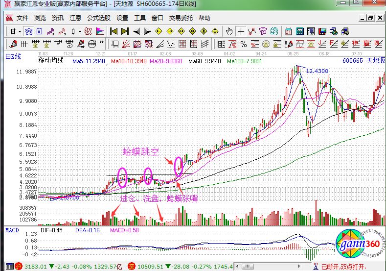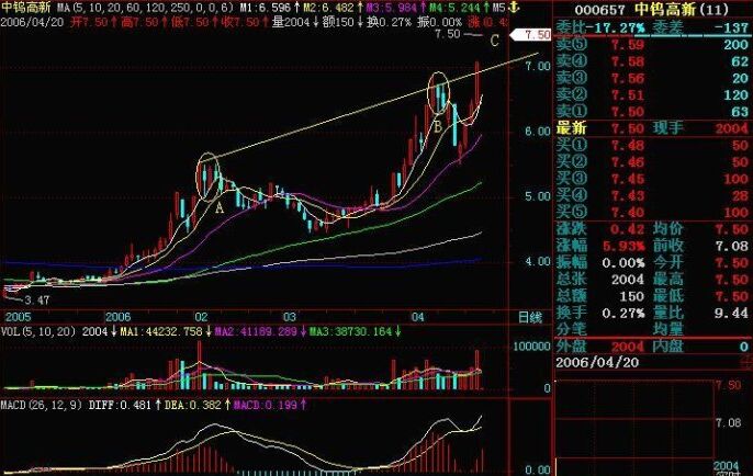 圖中的A、B兩點(diǎn)畫出個(gè)圓,那么我們就可以得到了一對(duì)蛤蟆眼是炯炯有神,60日與120日平均線就是蛤蟆張嘴,這是一種標(biāo)準(zhǔn)的莊股形態(tài),即金蛤蟆形態(tài)。圖中的AB線就是蛤蟆眼線,圖中前一天K吸納沖高該線,就是一種非常好的買入信號(hào)。