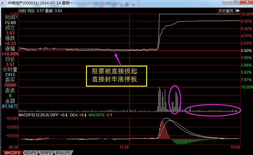 中糧地產在2014年7月14日的分時圖中,無盤之后,市場就傳出了這只股有重組的預期,隨后,該股就出現了旱地拔蔥的直線封板走勢,而且在封上漲停板之后,個股直接封牢,在沒有進行開盤。