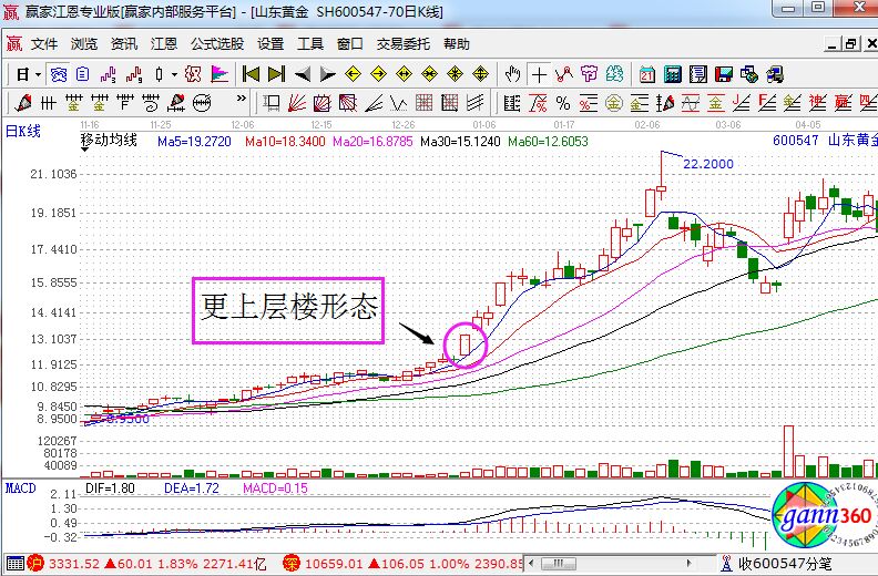 股票更上層樓是什么樣的?它其實指的就是股價在沿著上升通道運行,在接近歷史高點的位置,采取漲停板的方式進(jìn)行刷新歷史,并且創(chuàng)出新的高點,所以這樣的形態(tài)就是我們經(jīng)常所說的加速K線組合,因為它非常像“欲窮千里目,更上一層樓”,所以這樣的走勢形態(tài)就被稱作了更上層樓形態(tài)。如下面的山東黃金的走勢圖。