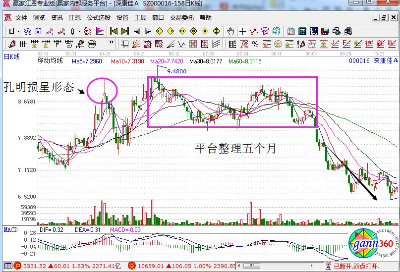 深康佳A在出現(xiàn)孔明損星形態(tài)之后,股價(jià)先死下跌,而后反彈原來的股價(jià)區(qū)域,然后開始了調(diào)整階段,而且調(diào)整的時(shí)間上大五個(gè)月之久,可見在這個(gè)區(qū)域中股價(jià)受到的阻力是非常大的。之后股價(jià)突破平臺(tái)整理向下開啟了下跌的行情,顯然在整理期間持股,是最為不明智的選擇,如下圖所示。