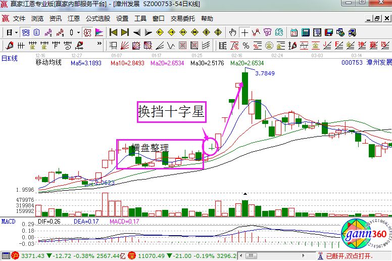換擋陰十字星形態是什么樣的?如果是從名字的來說,其實它就是一種趨勢在轉換的關鍵形態,它可以是有橫盤轉為上升的關鍵點,當然那也有可能有上升趨勢轉為下跌,更有可能在洗盤末期。當然它是一根陰十字形態,通常來說這種形態,一般是出現在橫盤整理區域的上方附近。接下來我們就通過漳州發展的走勢圖來進行講解。