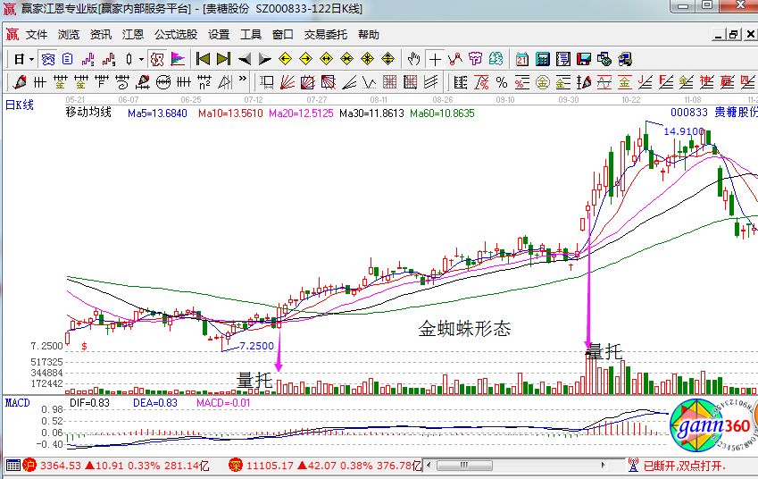 賺錢效應(yīng)迅速的擴(kuò)散,后來繼競買將價(jià)格持續(xù)推高,四條被打散的均線就如同伸開四腳的蜘蛛對價(jià)格形成支撐。所以這也是金蜘蛛形態(tài)的由來。出現(xiàn)金蜘蛛的時間周期越大的話,除了具備爆發(fā)力還同樣是具備持久性。接下來我們來看貴糖股份的走勢圖。