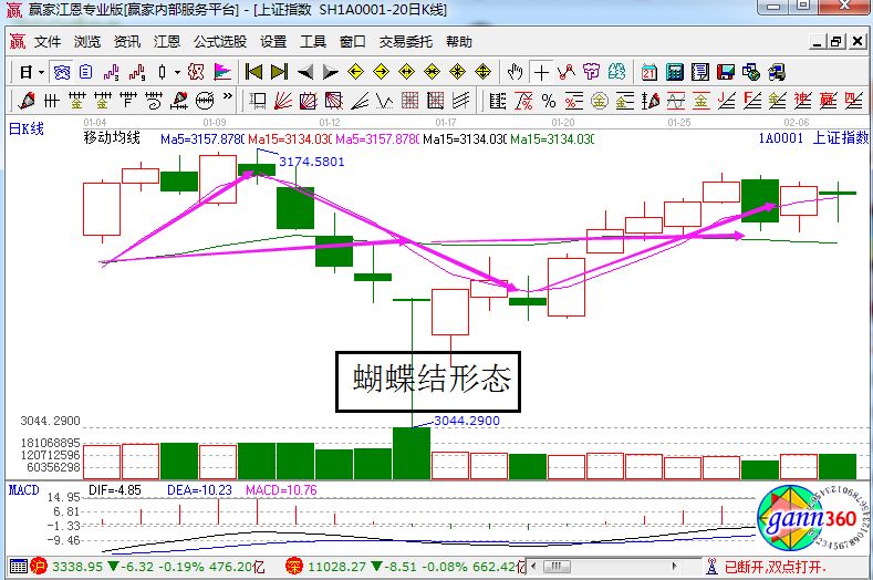 蝴蝶結形態形成之前,個股的大多是處于震蕩行情之中,而且在該形態形成的時候,5日均線上穿15日均線,說明了市場是處于被看好的情況,而且股價出現漲幅,不就有下坡15日均線,出現回落,在形態將要形成的時候,5日均線重新上穿15日均線形成了閉合的蝴蝶結形態,那么在此時就可以考慮介入了。