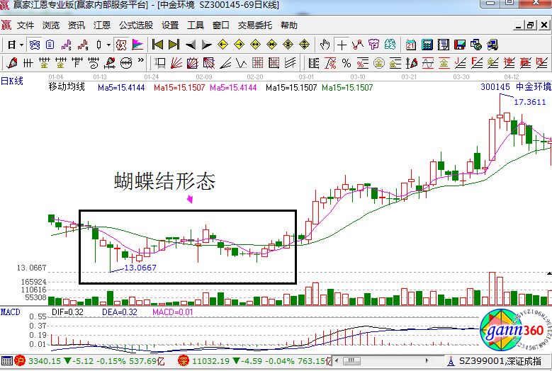 上圖是中金環境在今年2月份到4月份的走勢圖,從圖中我們可以看到該股就走出了非常典型的蝴蝶結走勢,而且正式的形成時間是在2月24日的形態,5日均線金叉15日均線,而且同時股價是放量突破了這兩條均線,顯然是非常好的買點,同時macd指標也形成了金叉的走勢,與該形態產生了共振,所以在這個形態的買入獲利的機會是非常大的。