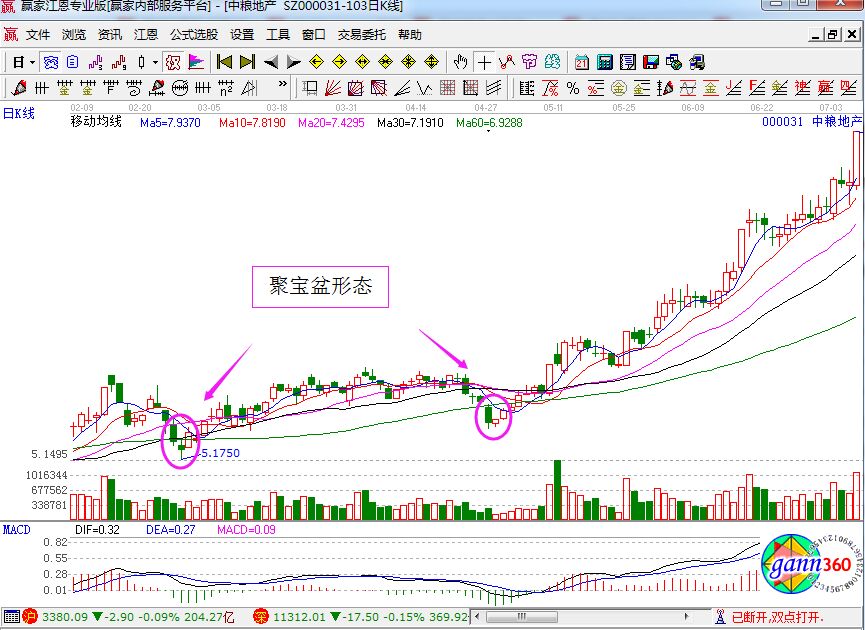 上圖是中糧地產的部分歷史走勢圖,從圖中我們看到,60日均線(綠色)的趨勢是向上的,而且K線已經成交量都非常的滿足上面的技術特征,所以是典型的聚寶盆形態。