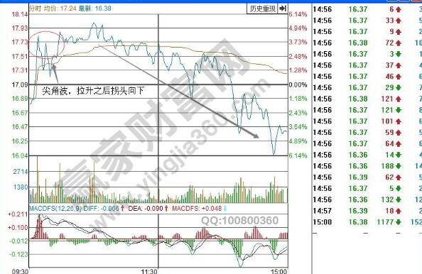 從當天的分時走勢中,我們可以看到該股在開盤出現(xiàn)了快速拉升,并且形成了分時圖中的尖角波形態(tài),之后拐頭向下,分時線和均價線開始向下運行,說明了股價下跌的趨勢已經形成了,所以是典型的跳空陰拉拐戰(zhàn)法的應用,投資者應該堅決的賣出,保存現(xiàn)有的利潤。