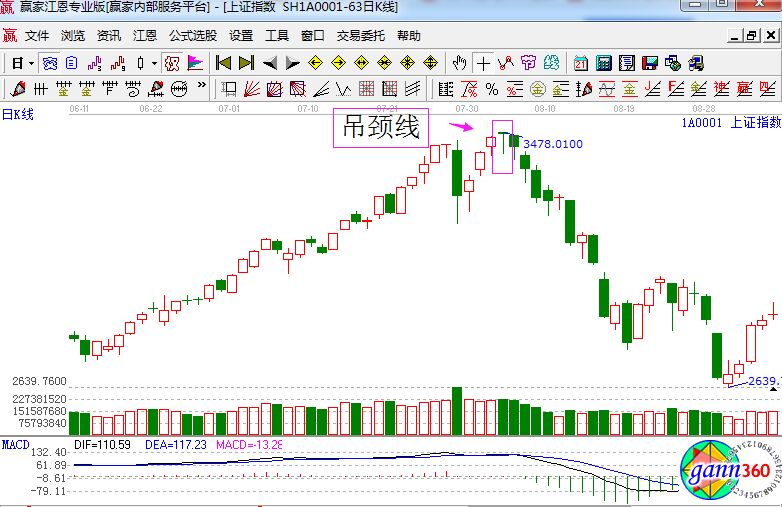 成交大量后吊頸,空方馬上來帶領。所以它是一種見頂信號,特別是之前有過大成交量的陽線拉升之后出現,實體短影線長,影線長度至少是實體兩倍。這種K線一般都是莊家震蕩型洗盤。
