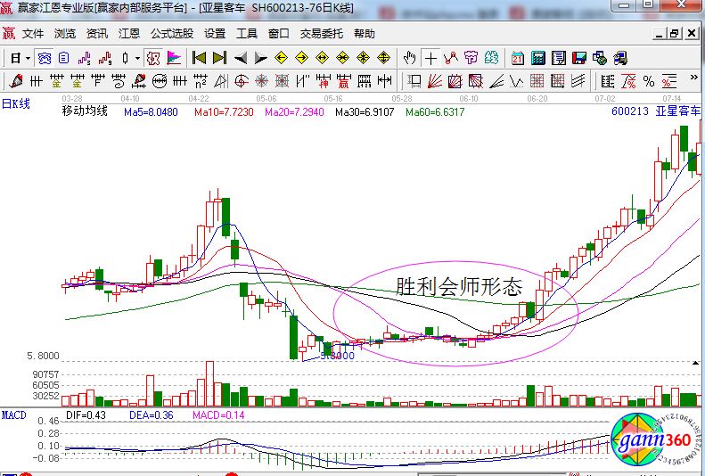 上圖中亞星客車在經(jīng)過了一段時(shí)間的下跌行情后,它的均線指標(biāo)在底部形成了勝利會(huì)師形態(tài),這個(gè)形態(tài)就說明了市場(chǎng)上由空方強(qiáng)勢(shì)變成了多、空雙方任持的局面,在6月20日的時(shí)候,多頭排列最終完成,顯然此時(shí)的買點(diǎn)已經(jīng)出現(xiàn)。