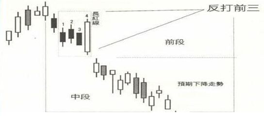 什么是初跌反打?它其實指的是:在下跌波的前段中,出現(xiàn)了一根長紅線,可以包含之前的三只K線,這基本上就是多頭逃命的機會,所以有人把它稱之為了救命稻草。如下圖所示。