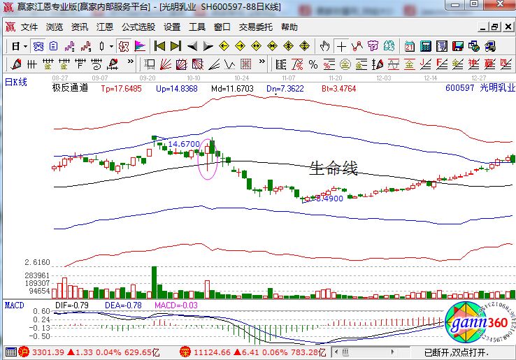 上面是光明乳業(yè)的在2007年10月份的走勢,股價在上漲的高位出現(xiàn)了一個具有長下影線的長陽線,其中它包絡了前面三個交易日的K線走勢,形成了典型的初跌反打前三的走勢形態(tài)。同時我們看均線上的走勢,它已經走出了拐頭向下的趨勢,成交量的量能逐漸的縮小,同時macd指標形成了死叉的賣出信號,顯然投資者應該及時把握賣出的機會。我們調出極反通道來進一步的分析股價所處的位置。