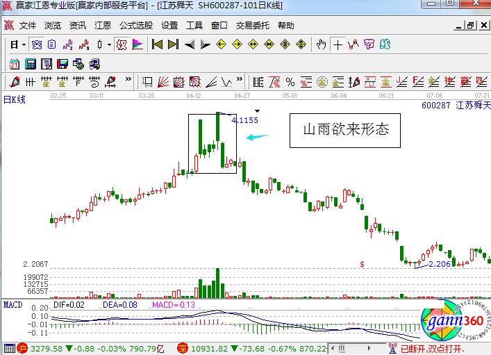 上圖是江蘇舜天的走勢圖,圖中該股形成的非常典型的山雨欲來走勢形態,我們看到在該形態之后股價形成了幾根的陰線,之后開始跌皮前面K線的位置,形成了下跌的趨勢,顯然該形態是一個非常典型的賣出信號。